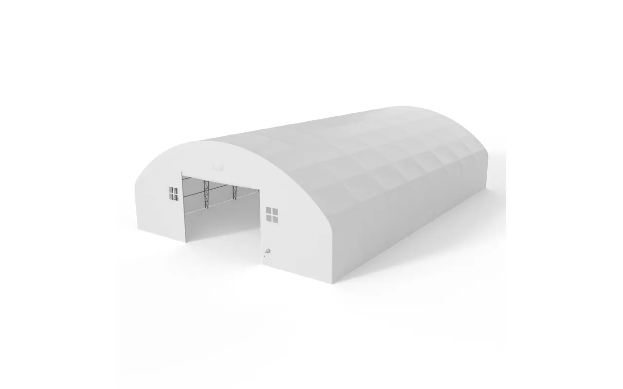 Hala namiotowa łukowa z pionowymi ścianami 15,25x18,3m PVC 750g/m² wykorzystuje stalowy stelaż w układzie dwupunktowej kratownicy, który zwiększa sztywność bryły i ułatwia bezpieczną eksploatację w zmiennych warunkach pogodowych. Poszycie wykonane z plandeki PVC dostępnej w wariancie 750 g/m² (standardowym) lub 900 g/m² (wzmocnionym) zapewnia odporność na deszcz, śnieg, wiatr oraz promieniowanie UV. Hala wyposażona jest w mechaniczną bramę obsługiwaną ręcznie, bez automatyki, co upraszcza użytkowanie i ogranicza ryzyko awarii. Wymiar bramy (szer. × wys.): 6,1 x 4,5 m – parametr pozwala dopasować wjazd do maszyn i pojazdów wykorzystywanych w działalności.