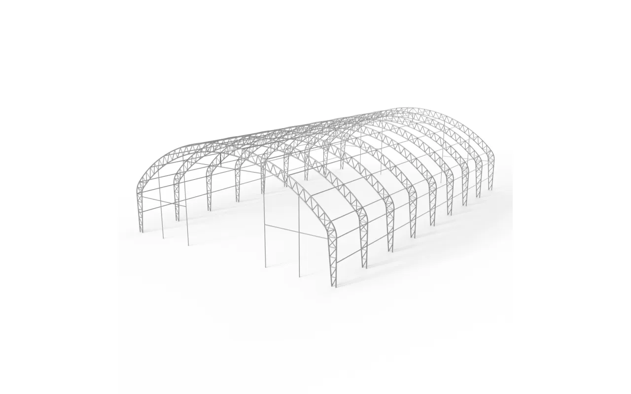 Hala namiotowa łukowa z pionowymi ścianami 15,25x24,4m PVC 900g/m² wykorzystuje stalowy stelaż w układzie dwupunktowej kratownicy, który zwiększa sztywność bryły i ułatwia bezpieczną eksploatację w zmiennych warunkach pogodowych. Poszycie wykonane z plandeki PVC dostępnej w wariancie 750 g/m² (standardowym) lub 900 g/m² (wzmocnionym) zapewnia odporność na deszcz, śnieg, wiatr oraz promieniowanie UV. Hala wyposażona jest w mechaniczną bramę obsługiwaną ręcznie, bez automatyki, co upraszcza użytkowanie i ogranicza ryzyko awarii. Wymiar bramy (szer. × wys.): 6,1 x 4,5 m – parametr pozwala dopasować wjazd do maszyn i pojazdów wykorzystywanych w działalności.
