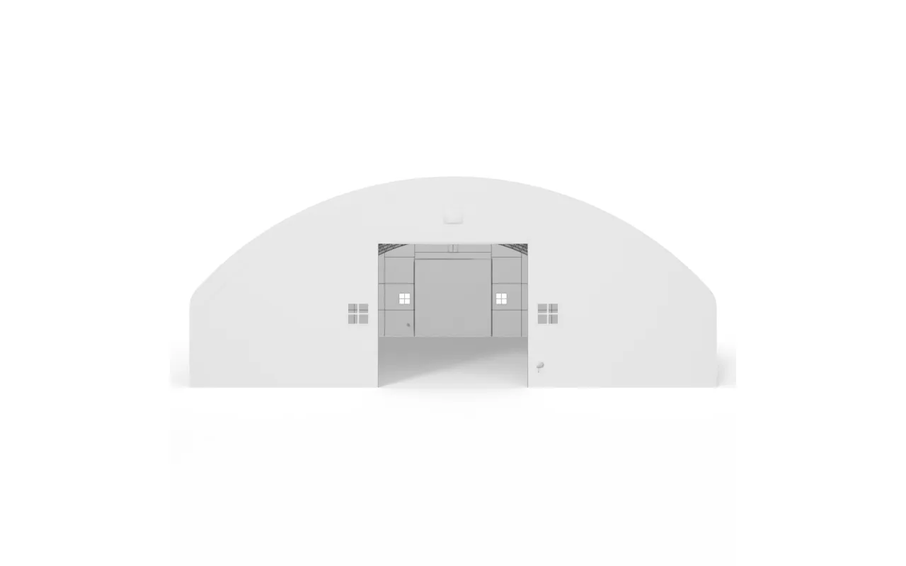 Hala namiotowa łukowa z pionowymi ścianami 21,5x30,05m PVC 900g/m² wykorzystuje stalowy stelaż w układzie dwupunktowej kratownicy, który zwiększa sztywność bryły i ułatwia bezpieczną eksploatację w zmiennych warunkach pogodowych. Poszycie wykonane z plandeki PVC dostępnej w wariancie 750 g/m² (standardowym) lub 900 g/m² (wzmocnionym) zapewnia odporność na deszcz, śnieg, wiatr oraz promieniowanie UV. Hala wyposażona jest w mechaniczną bramę obsługiwaną ręcznie, bez automatyki, co upraszcza użytkowanie i ogranicza ryzyko awarii. Wymiar bramy (szer. × wys.): 6,1 x 6,1 m – parametr pozwala dopasować wjazd do maszyn i pojazdów wykorzystywanych w działalności.