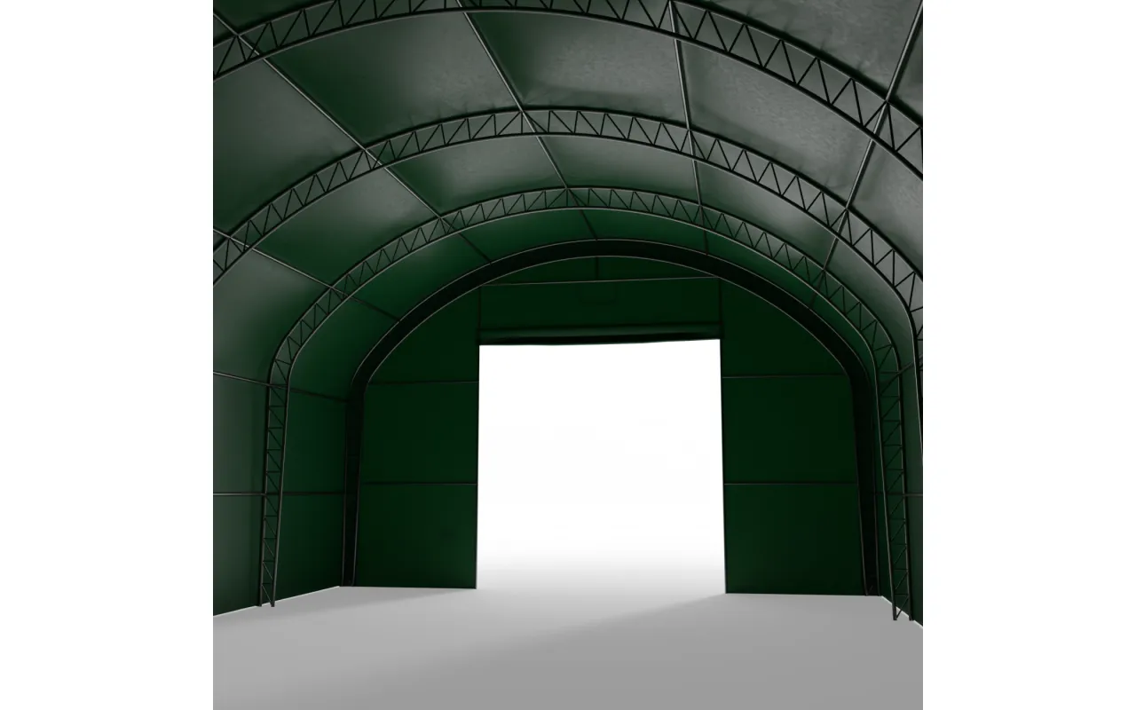 Hala namiotowa łukowa z pionowymi ścianami 12,2x24,4m PVC 900g/m² w wersji zielonej wykorzystuje stalowy stelaż w układzie dwupunktowej kratownicy, który zwiększa sztywność bryły i ułatwia bezpieczną eksploatację w zmiennych warunkach pogodowych. Poszycie wykonane z plandeki PVC dostępnej w wariancie 750 g/m² (standardowym) lub 900 g/m² (wzmocnionym) zapewnia odporność na deszcz, śnieg, wiatr oraz promieniowanie UV. Hala wyposażona jest w mechaniczną bramę obsługiwaną ręcznie, bez automatyki, co upraszcza użytkowanie i ogranicza ryzyko awarii. Wymiar bramy (szer. × wys.): 6,1 x 4,5 m – parametr pozwala dopasować wjazd do maszyn i pojazdów wykorzystywanych w działalności.