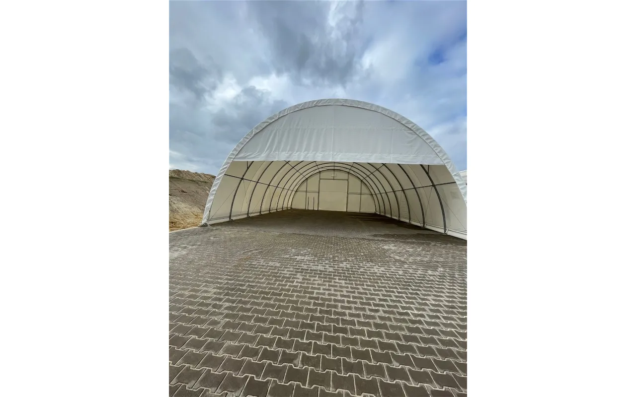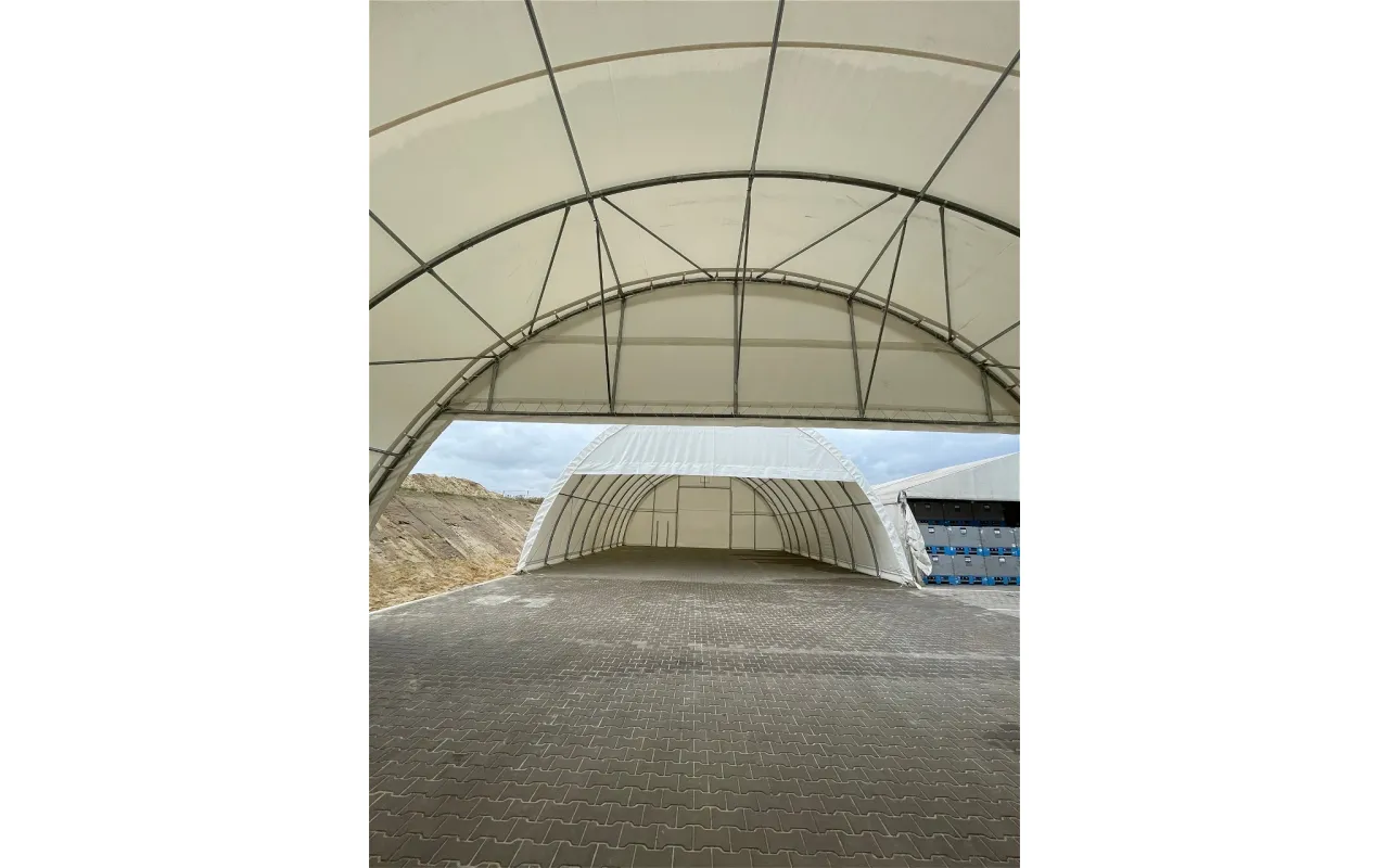 Osłona szczytowa ze stelażem o zakresie 2,6 m to szybkie rozwiązanie, które pozwala częściowo osłonić przestrzeń od strony szczytowej w hali łukowej o szerokości 12 m. Dzięki zastosowaniu plandeki PVC 750g/m² osłona dobrze znosi codzienną eksploatację i chroni wnętrze hali przed nawiewanym śniegiem czy deszczem.