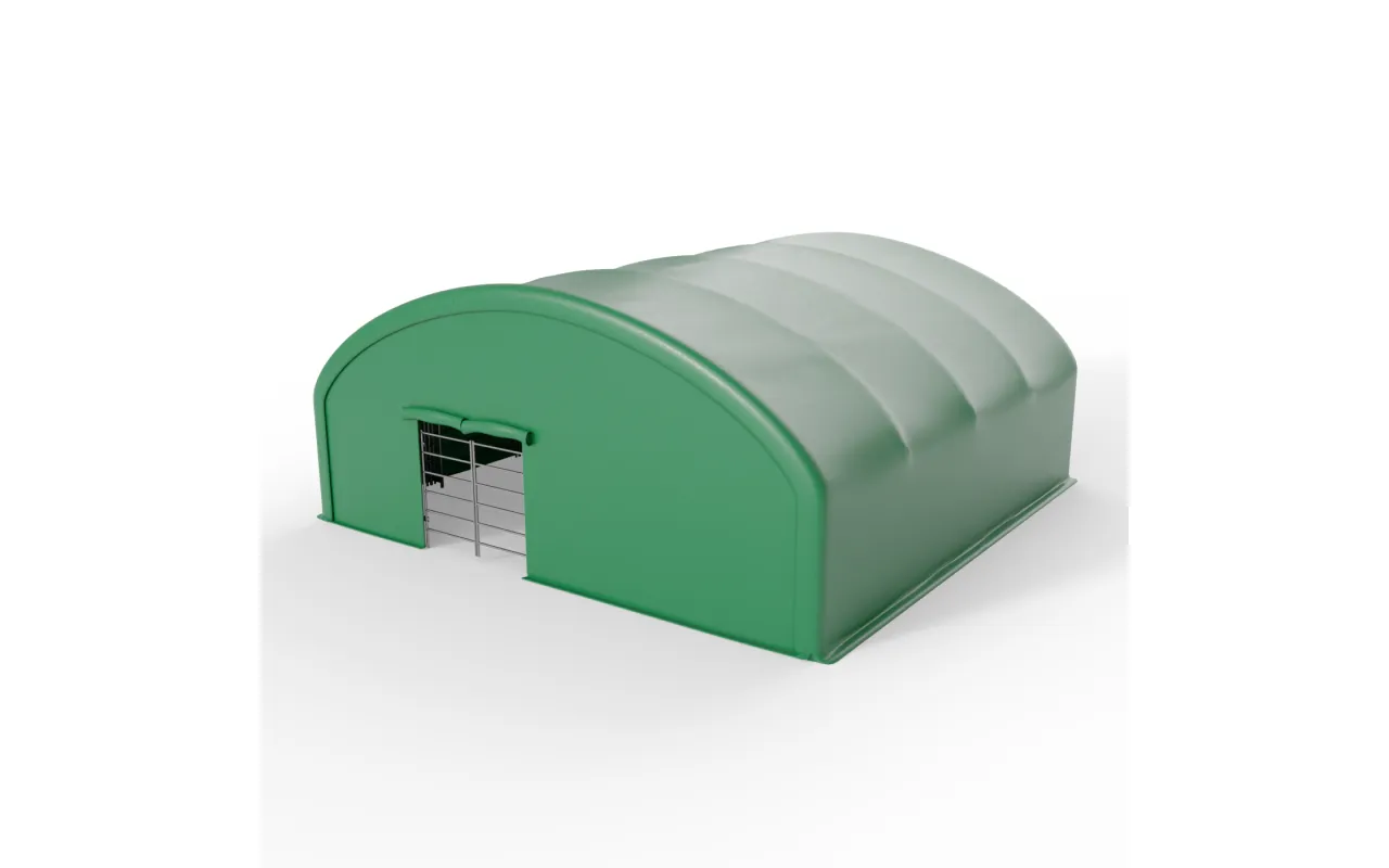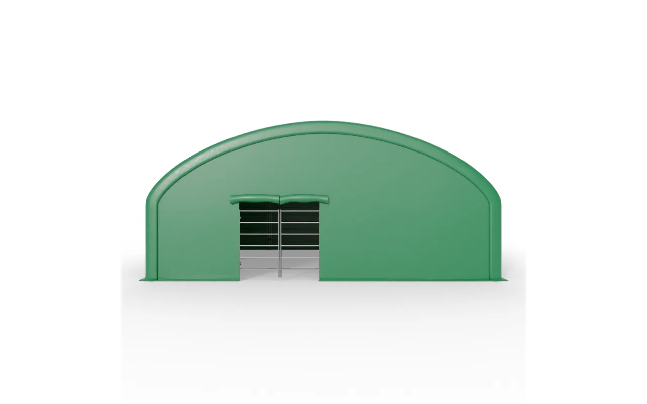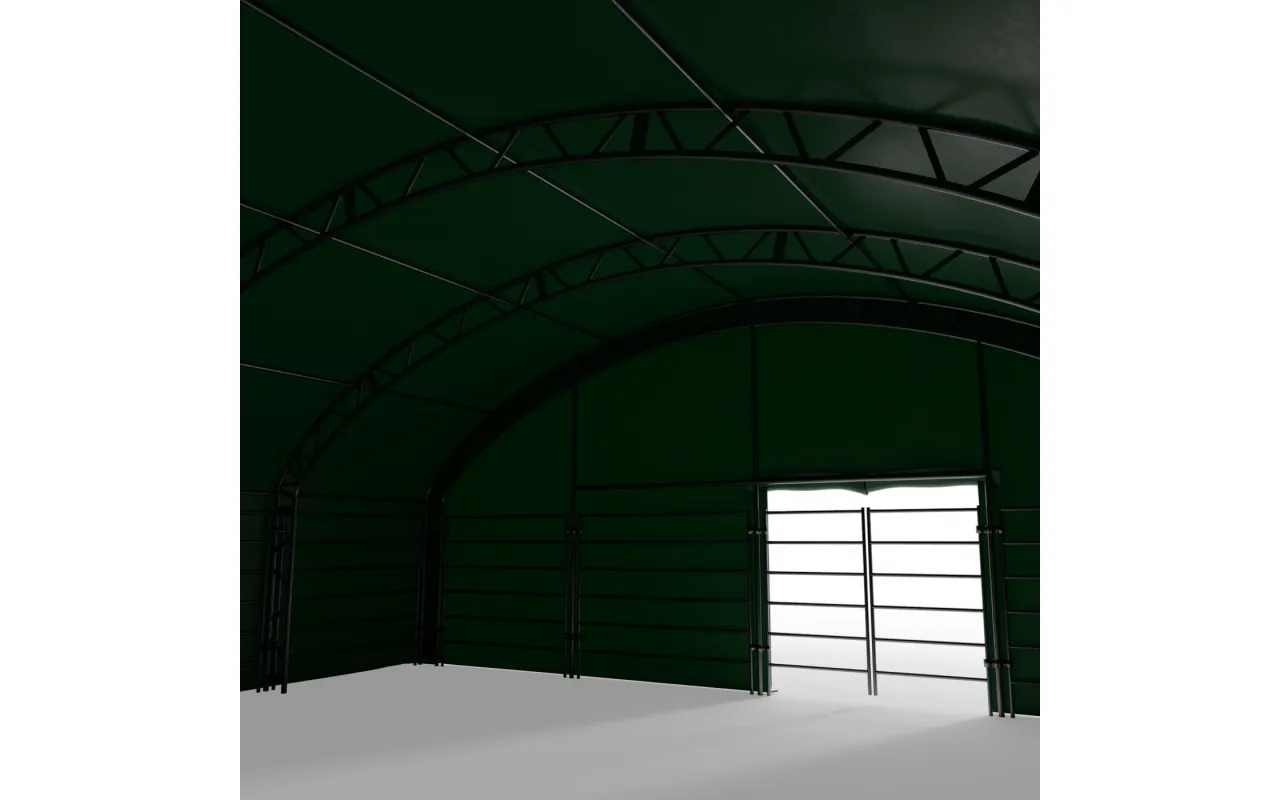 Ściana frontowa do zagrody dla zwierząt 10x10m PVC 750g/m² to gotowy moduł z plandeki PVC, który zamyka wejście do zagrody i ogranicza wpływ wiatru, opadów oraz chłodu na przestrzeń, w której przebywają zwierzęta. Montowana na istniejącym stelażu konstrukcji Gazelt, bez dodatkowych elementów nośnych, ściana frontowa stanowi naturalne uzupełnienie zagrody – nie jest osobną halą, lecz dopasowanym komponentem systemu. Dzięki Ściana frontowa do zagrody dla zwierząt 10x10m PVC 750g/m² wnętrze pozostaje bardziej suche, osłonięte przed przeciągami i łatwiejsze do utrzymania w czystości, co przekłada się na wyższy komfort koni, bydła, owiec, kóz, alpak czy lam, zarówno w gospodarstwach rolnych, jak i w ośrodkach agroturystycznych czy sezonowych stanowiskach hodowlanych.
