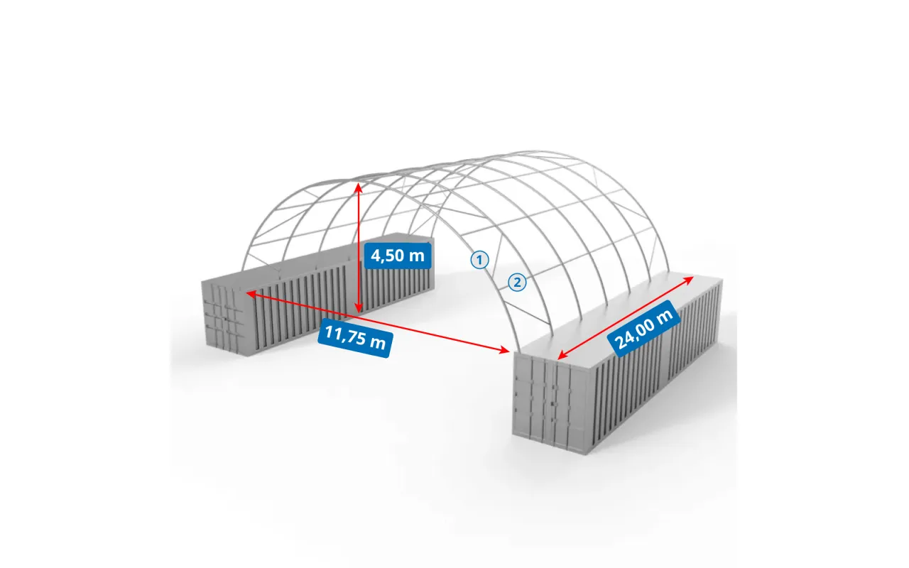 Zadaszenie kontenerowe wzmocnione 12x24m to wszechstronność i innowacyjność namiotowego zadaszenia. Zaprojektowanego z myślą o ochronie i zabezpieczeniu przestrzeni między kontenerami. Stanowi idealne rozwiązanie dla firm logistycznych, magazynów oraz placów budowy, oferując niezawodną ochronę przed niekorzystnymi warunkami atmosferycznymi, takimi jak deszcz, śnieg czy intensywne promienie słoneczne. Wzmocnione zadaszenie kontenerowe 12x24m wykonane jest z trwałego materiału PVC gwarantuje to długotrwałe użytkowanie i wytrzymałość, zapewniając maksymalne bezpieczeństwo. Zadaszenia kontenerowe PVC charakteryzują się indywidualnym dostosowaniem do potrzeb klienta. Jesteśmy w stanie stworzyć przestrzeń zamkniętą z każdej strony wyposażoną w bramę wjazdową lub drzwi wejściowe. Często nazywane są zadaszeniami przenośnymi, ponieważ są łatwe w montażu i pozwalają na szybką zmianę lokalizacji względem zmieniających się potrzeb.